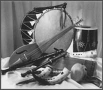 Instruments in illustration, from left, rebec fiddle, recorders, gemshorn flutes, Tambouran de Bearne and, in the background, Medieval drums. (Photo by Joan Snow) Rebec. The Medieval ancestor of the contemporary violin and cello. It's played with a bow while the instrument is held in a vertical position. Recorder. An end-blown flute popular throughout Europe during the Middle Ages and Renaissance. Gemshorn. A flute created out of the hollowed horn of a cow or ox. The large end is covered, except for a hole for blowing. Fingering and hole placement are much like the recorder. The haunting sound of the gemshorn is featured in a solo setting on cuts 4, 8 and 11. The gemshorn was originally made out of the horn of the now extinct gems ox. Tambouran De Bearne. A cross between a guitar and a drum. It has three sets of strings grouped together that will produce a chord when struck with a hammer. It is limited, though, to playing three chords. Rankett. A reed instrument used to provide a deep drone.